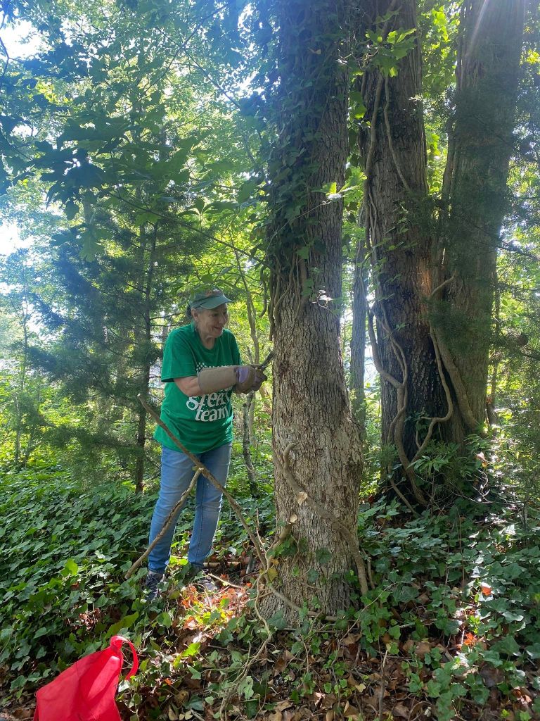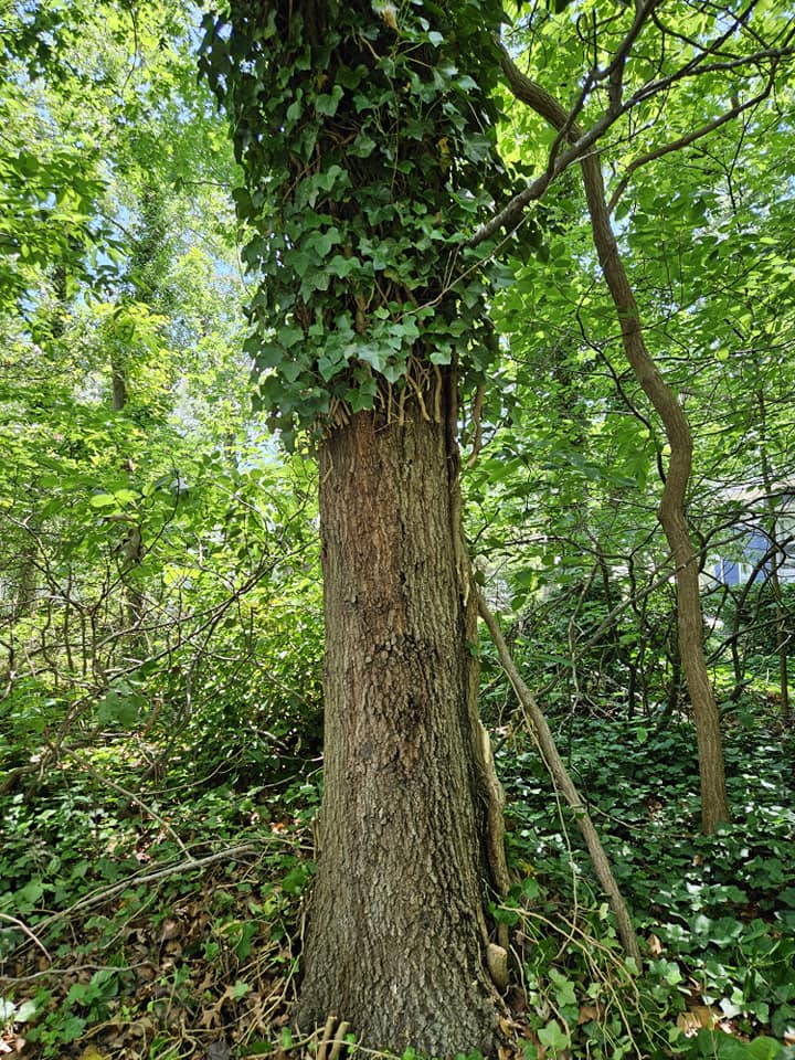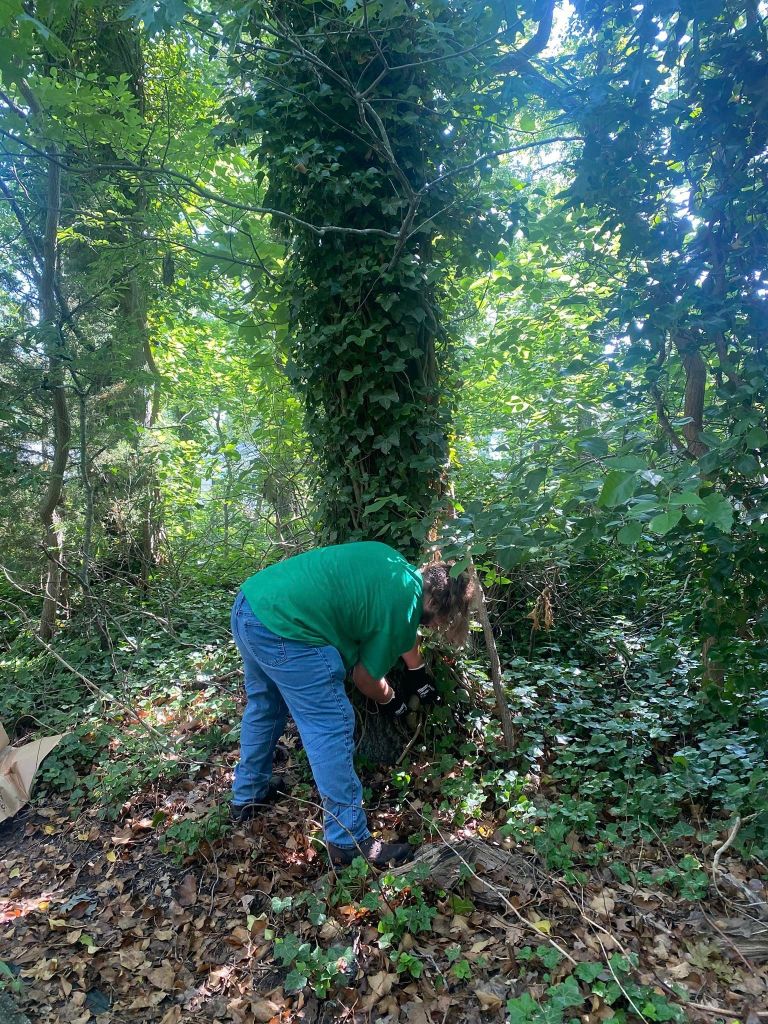 The focus for June 25th was on learning about and removing two invasive plants that are abundant at the park: Oriental Bittersweet and English Ivy. These vines grow up trees and smother their leaves killing them over time. This can lead to dead hazard trees that are expensive to remove, dangerous, and unsightly. Not good! Additionally, these invasive plants can become habitat for invasive animals, such as spotted lanternflies. Also not good! We made a great start today on our eradication plan. Please check out the picture gallery below. And if you are interested in participating in our next event (and who wouldn’t?), or just want to pass along some thoughts about the project, please reach out to us on our contact page, or facebook page, or if you enjoy the nostalgia and quaintness of a slower slower response, please post a message on paper and hide it under a painted rock in Herritage Park (though, for speediest replies, we would appreciate some hints as to where you have hidden said message).